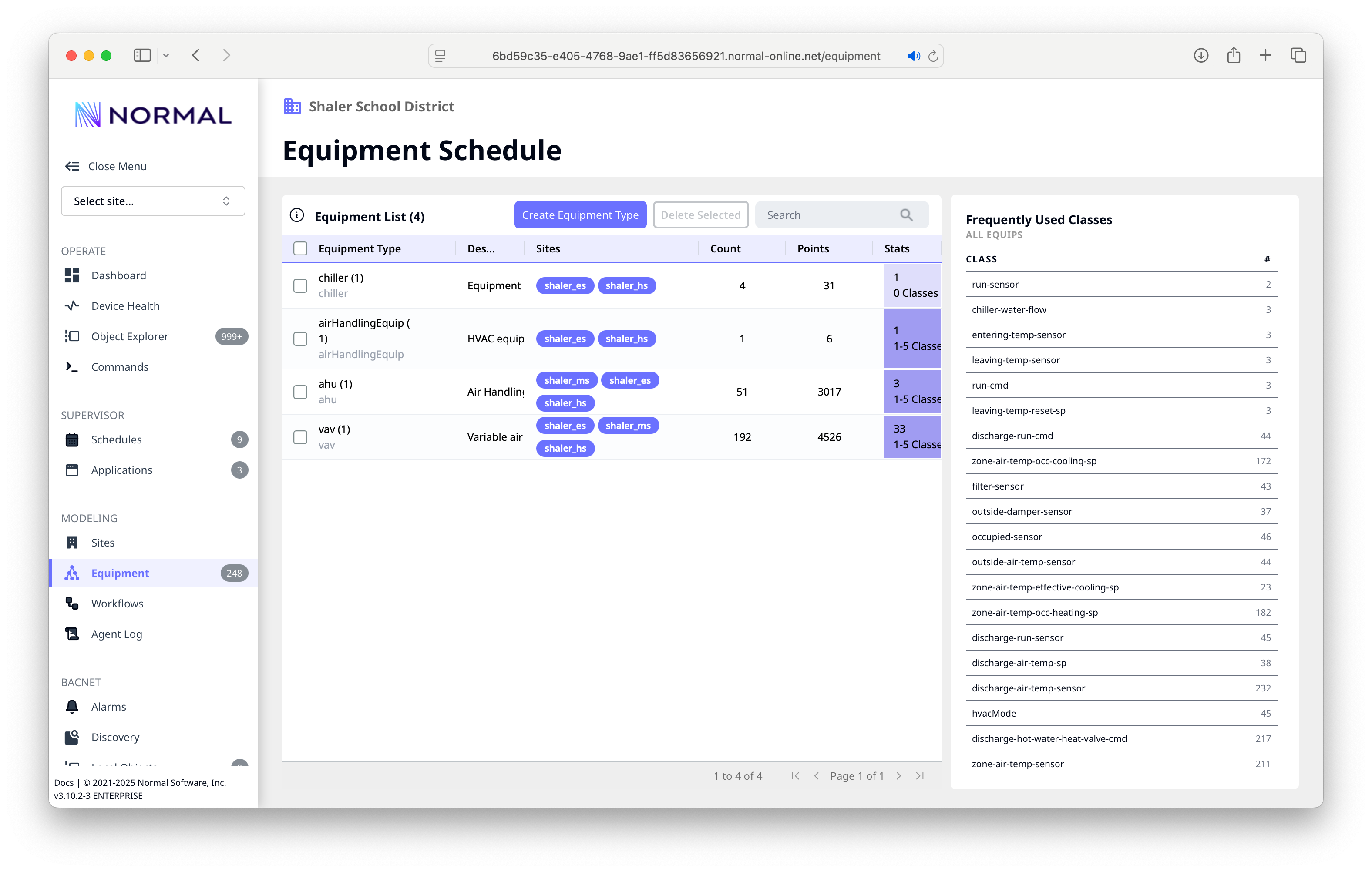 - Equipment types -- grouped by type (chiller, AHU, VAV, etc.) with instance counts and point totals